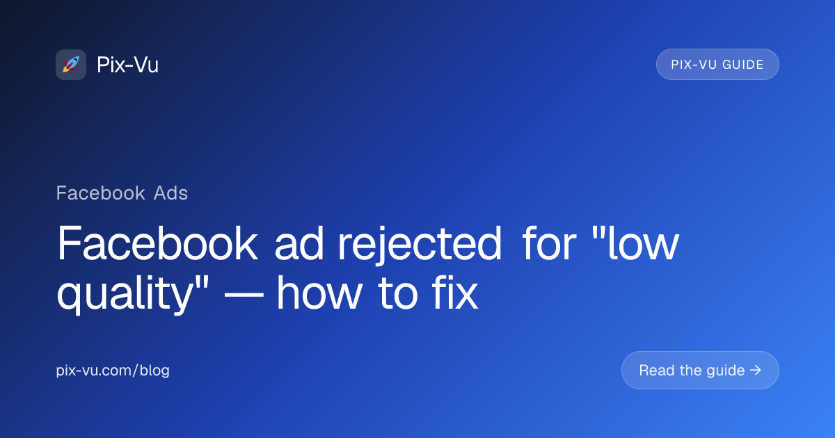 If your low-quality flag is being triggered by image artefacts — pixelation, low resolution, poor compression — that's a fix you can do in five minutes. Pix-Vu cleans up ad creatives so they pass Meta's image-quality checks without re-shooting. Run your rejected ad through it before resubmitting and you'll often clear the visual flag straight away.