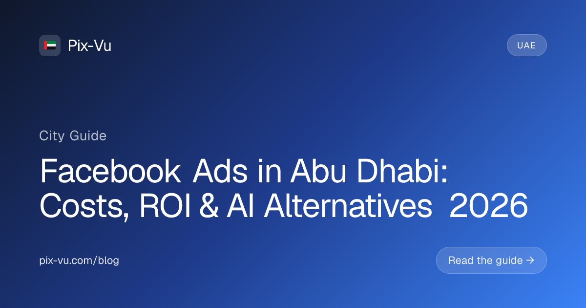 Facebook ads in Abu Dhabi cost an average of $10.80 CPM and $1.35 CPC in 2026, with a typical CTR of 1.18% and a cost per acquisition between $21-$105. Hiring a Facebook ads agency in Abu Dhabi runs $1,900-$8,500/month before ad spend, while AI-powered alternatives like Pix-Vu start at $49/month and manage the same campaigns automatically. For most Abu Dhabi businesses spending under $10K/month on ads, AI delivers better ROI than traditional agencies.