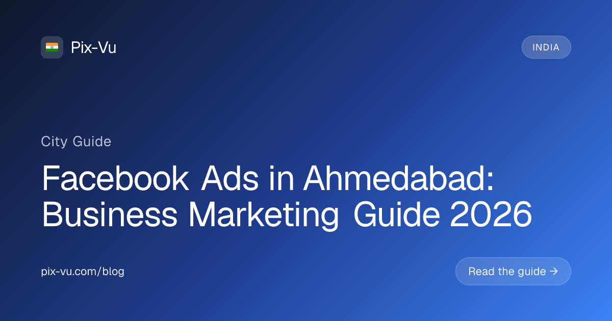 Facebook Ads in Ahmedabad cost approximately ₹28–90 CPM and ₹3–13 CPC in 2026, with a typical click-through rate of 1.5–2.7%. Ahmedabad (population 8 million metro) is one of India's most competitive ad markets, with the strongest demand from textiles, pharma, jewellery, real estate, retail. The most effective campaigns use Gujarati, Hindi, English creative, target peak engagement hours of 8–11pm IST, and run mobile-first formats. Pix-Vu automates the entire process from $99/month with no agency fees.