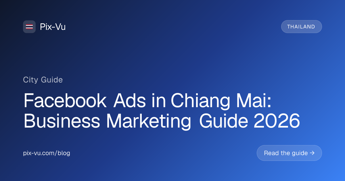 Facebook Ads in Chiang Mai cost approximately ฿60–200 CPM and ฿6–25 CPC in 2026, with a typical click-through rate of 1.7–3.2%. Chiang Mai (population 1.2 million metro) is one of Thailand's most competitive ad markets, with the strongest demand from tourism, hospitality, wellness, education, expat services. The most effective campaigns use Thai, English creative, target peak engagement hours of 8–10pm ICT, and run mobile-first formats. Pix-Vu automates the entire process from $99/month with no agency fees.
