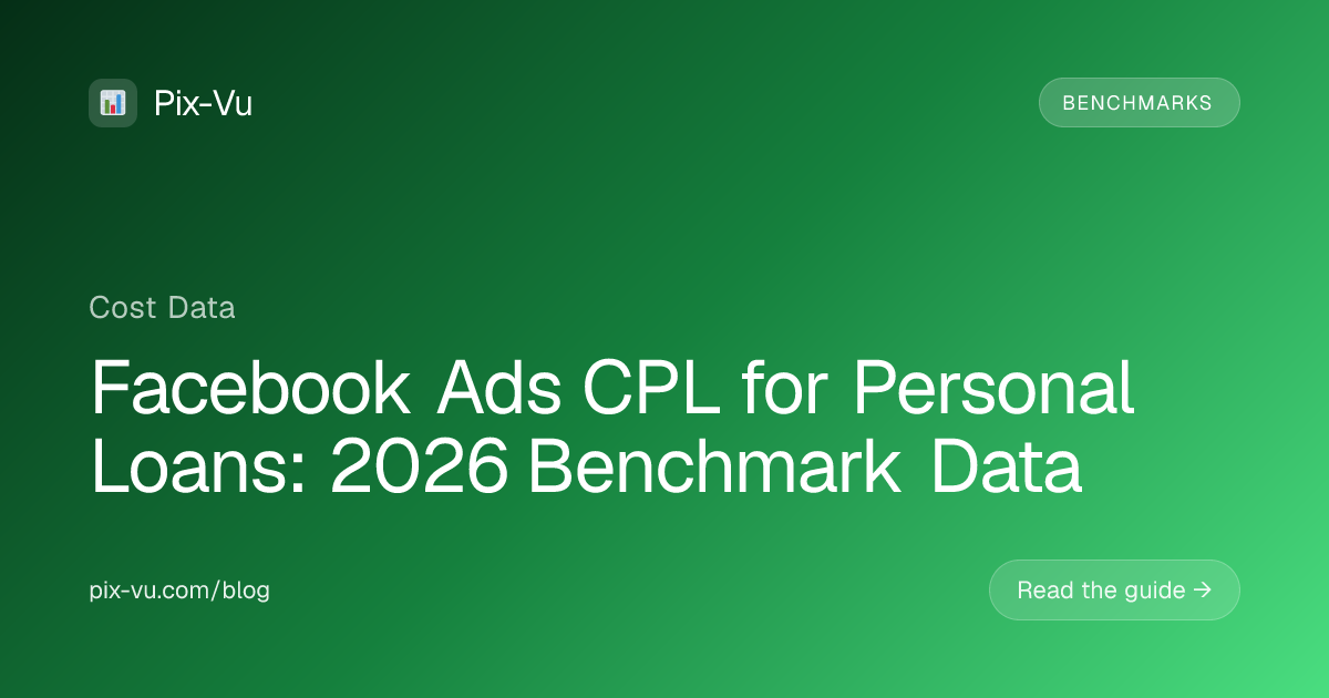 Benchmarks are useful, but the only CPL that matters is the one in your own account. Pix-Vu gives personal loans businesses a clean, single-dashboard view of Facebook Ads spend, lead volume, and cost per lead — without the spreadsheet wrangling. You'll see which campaigns are coming in below the benchmarks above and which are quietly draining budget, so you can shift spend before the month ends instead of after. Try Pix-Vu free at https://pix-vu.com.