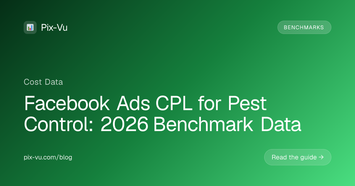 Benchmarks are useful, but the only CPL that matters is the one in your own account. Pix-Vu gives pest control businesses a clean, single-dashboard view of Facebook Ads spend, lead volume, and cost per lead — without the spreadsheet wrangling. You'll see which campaigns are coming in below the benchmarks above and which are quietly draining budget, so you can shift spend before the month ends instead of after. Try Pix-Vu free at https://pix-vu.com.
