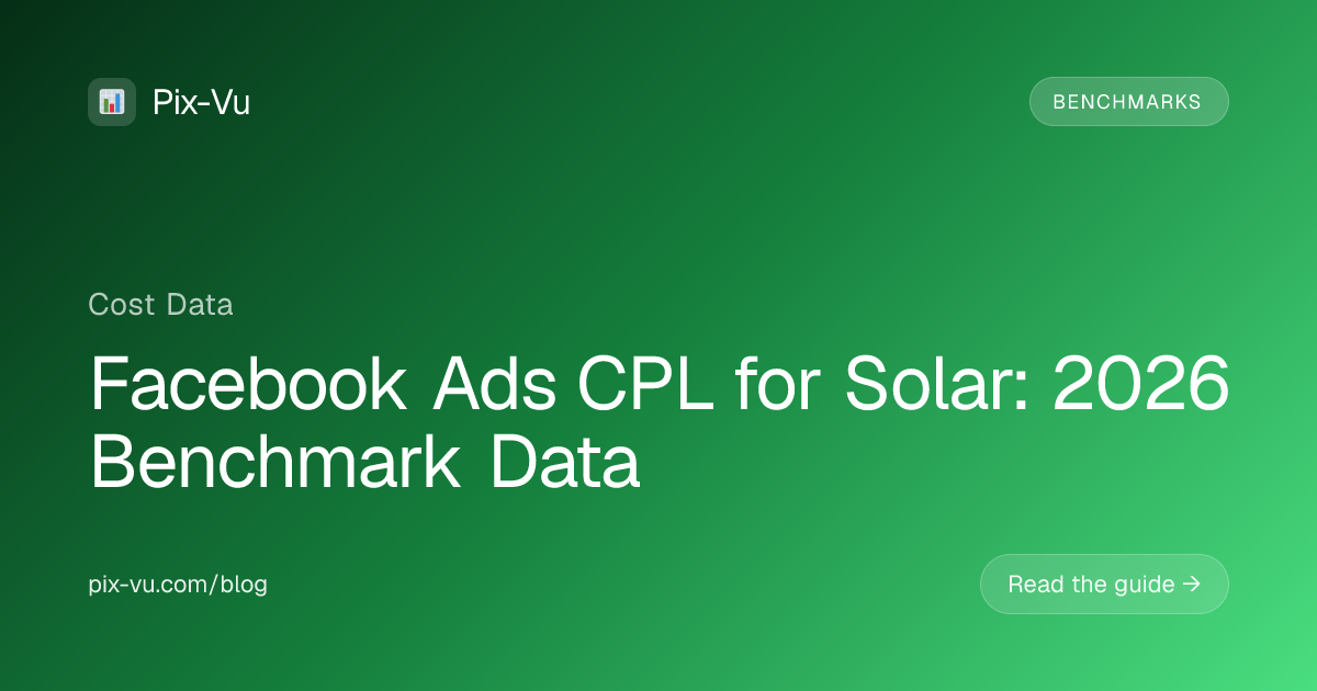 Benchmarks are useful, but the only CPL that matters is the one in your own account. Pix-Vu gives solar businesses a clean, single-dashboard view of Facebook Ads spend, lead volume, and cost per lead — without the spreadsheet wrangling. You'll see which campaigns are coming in below the benchmarks above and which are quietly draining budget, so you can shift spend before the month ends instead of after. Try Pix-Vu free at https://pix-vu.com.