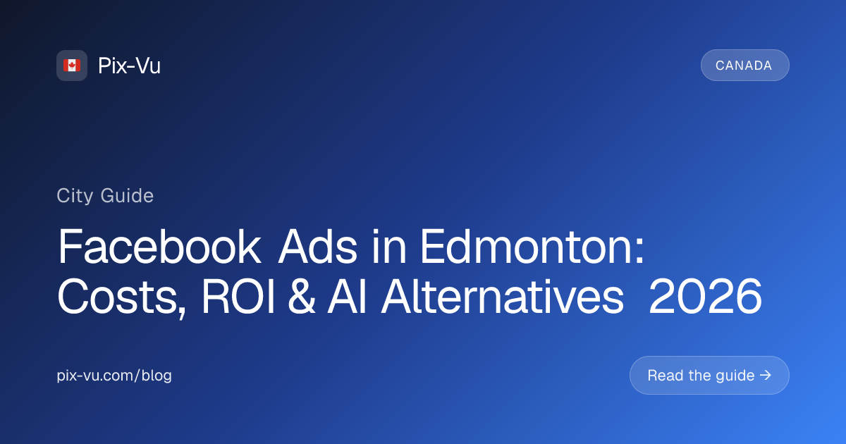 Facebook ads in Edmonton cost an average of $9.20 CPM and $1.15 CPC in 2026, with a typical CTR of 1.22% and a cost per acquisition between $18-$82. Hiring a Facebook ads agency in Edmonton runs $1,700-$6,500/month before ad spend, while AI-powered alternatives like Pix-Vu start at $49/month and manage the same campaigns automatically. For most Edmonton businesses spending under $10K/month on ads, AI delivers better ROI than traditional agencies.