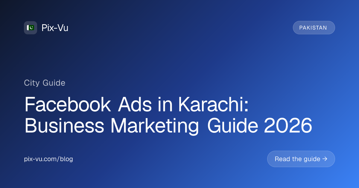 Facebook Ads in Karachi cost approximately ₨180–550 CPM and ₨18–65 CPC in 2026, with a typical click-through rate of 1.5–2.8%. Karachi (population 20 million metro) is one of Pakistan's most competitive ad markets, with the strongest demand from e-commerce, fashion, real estate, fintech, F&B. The most effective campaigns use Urdu, English, Sindhi creative, target peak engagement hours of 8–11pm PKT, and run mobile-first formats. Pix-Vu automates the entire process from $99/month with no agency fees.