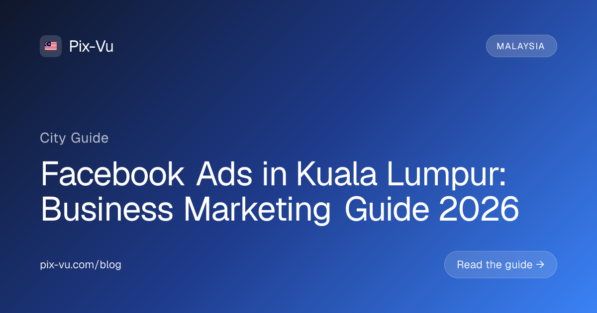 Facebook Ads in Kuala Lumpur cost approximately RM10–35 CPM and RM1–4 CPC in 2026, with a typical click-through rate of 1.5–2.9%. Kuala Lumpur (population 8 million Klang Valley) is one of Malaysia's most competitive ad markets, with the strongest demand from fintech, e-commerce, F&B, automotive, real estate. The most effective campaigns use Bahasa Malaysia, English, Mandarin, Tamil creative, target peak engagement hours of 8–11pm MYT, and run mobile-first formats. Pix-Vu automates the entire process from $99/month with no agency fees.