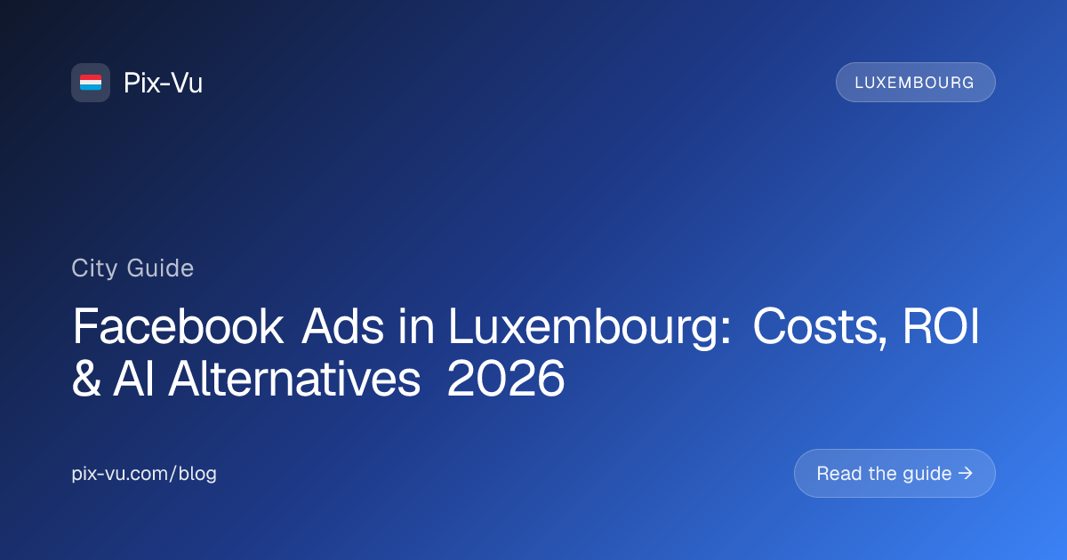 Facebook ads in Luxembourg cost an average of $13.90 CPM and $1.80 CPC in 2026, with a typical CTR of 0.92% and a cost per acquisition between $30-$120. Hiring a Facebook ads agency in Luxembourg runs $2,400-$8,500/month before ad spend, while AI-powered alternatives like Pix-Vu start at $49/month and manage the same campaigns automatically. For most Luxembourg businesses spending under $10K/month on ads, AI delivers better ROI than traditional agencies.