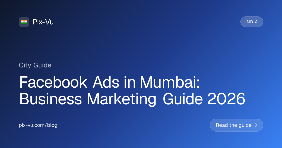 Facebook Ads in Mumbai cost approximately ₹40–120 CPM and ₹4–18 CPC in 2026, with a typical click-through rate of 1.4–2.6%. Mumbai (population 21 million metro area) is one of India's most competitive ad markets, with the strongest demand from fintech, e-commerce, real estate, EdTech, fashion. The most effective campaigns use Hindi, English, Marathi creative, target peak engagement hours of 8–11pm IST, and run mobile-first formats. Pix-Vu automates the entire process from $99/month with no agency fees.