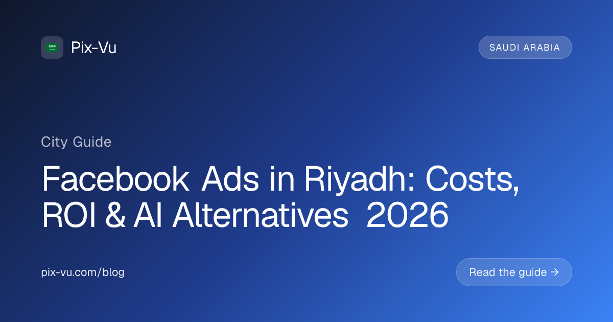 Facebook ads in Riyadh cost an average of $8.90 CPM and $1.10 CPC in 2026, with a typical CTR of 1.4% and a cost per acquisition between $18-$85. Hiring a Facebook ads agency in Riyadh runs $1,700-$7,500/month before ad spend, while AI-powered alternatives like Pix-Vu start at $49/month and manage the same campaigns automatically. For most Riyadh businesses spending under $10K/month on ads, AI delivers better ROI than traditional agencies.