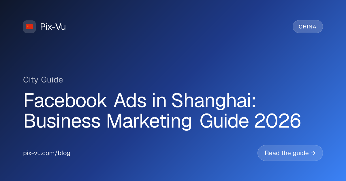 Facebook is officially blocked in mainland China, so Facebook Ads in Shanghai reach only expats, international school families, and VPN users — roughly 0.5 million reachable (expats/VPN). Local brands instead use WeChat, Douyin, and Weibo. However, Facebook Ads remain valuable for cross-border campaigns — Shenzhen exporters, Shanghai luxury brands, and Beijing tourism boards regularly run Facebook campaigns targeting customers in the US, EU, and Southeast Asia. Pix-Vu automates these cross-border campaigns from $99/month with multi-language creative generation.