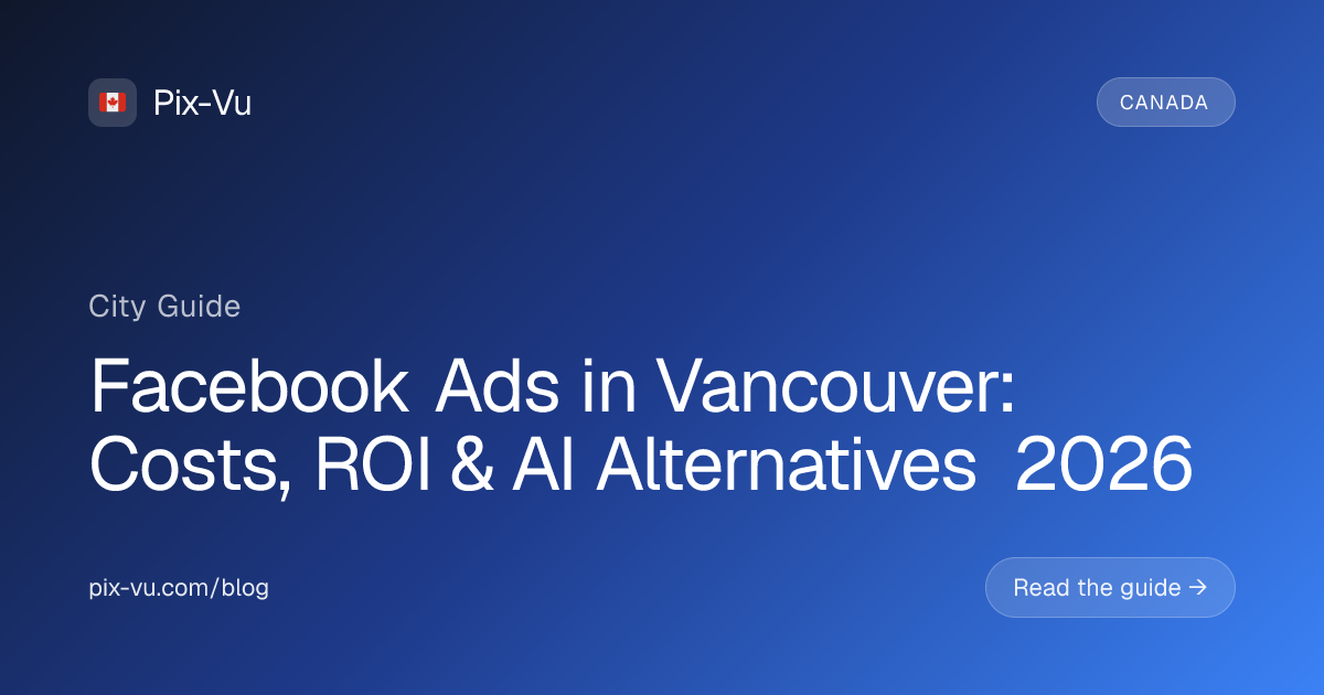 Facebook ads in Vancouver cost an average of $11.40 CPM and $1.45 CPC in 2026, with a typical CTR of 1.12% and a cost per acquisition between $23-$95. Hiring a Facebook ads agency in Vancouver runs $2,000-$8,000/month before ad spend, while AI-powered alternatives like Pix-Vu start at $49/month and manage the same campaigns automatically. For most Vancouver businesses spending under $10K/month on ads, AI delivers better ROI than traditional agencies.
