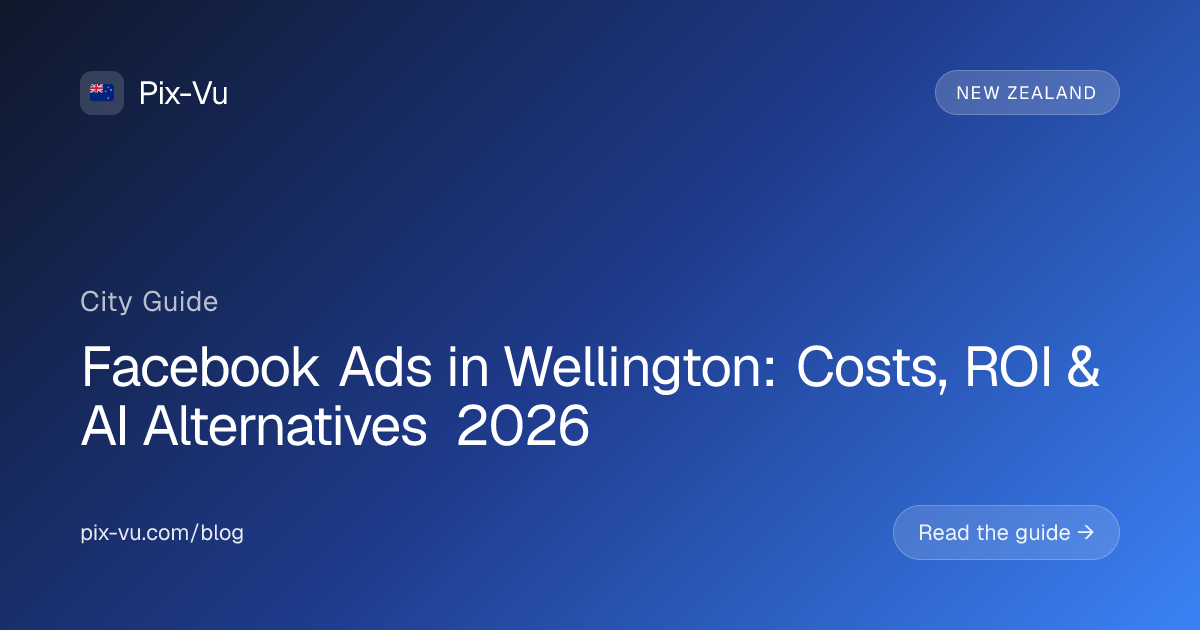 Facebook ads in Wellington cost an average of $10.10 CPM and $1.30 CPC in 2026, with a typical CTR of 1.1% and a cost per acquisition between $21-$85. Hiring a Facebook ads agency in Wellington runs $1,800-$6,800/month before ad spend, while AI-powered alternatives like Pix-Vu start at $49/month and manage the same campaigns automatically. For most Wellington businesses spending under $10K/month on ads, AI delivers better ROI than traditional agencies.