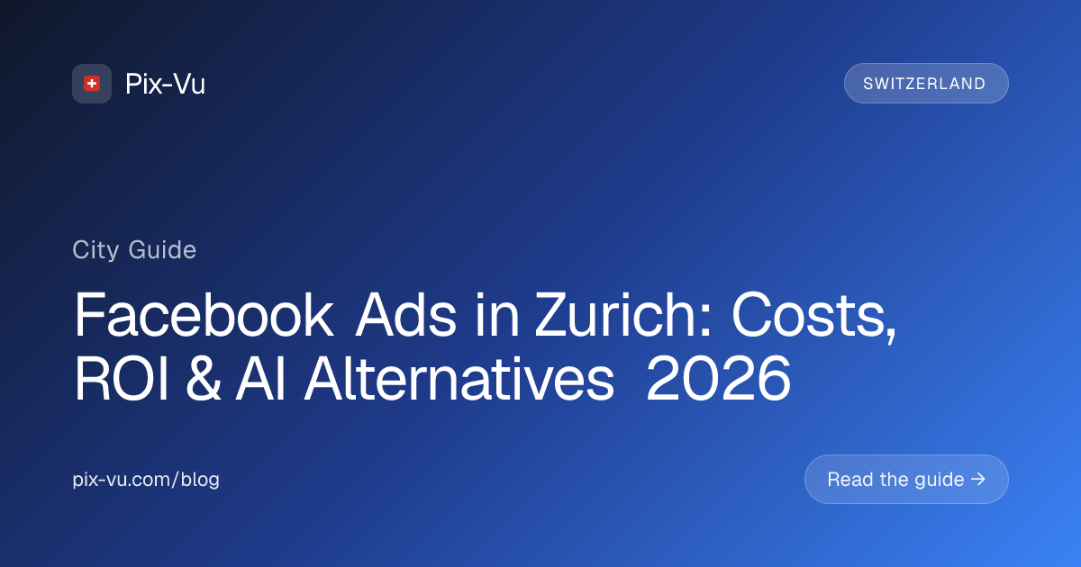 Facebook ads in Zurich cost an average of $16.80 CPM and $2.20 CPC in 2026, with a typical CTR of 0.85% and a cost per acquisition between $35-$140. Hiring a Facebook ads agency in Zurich runs $2,800-$10,000/month before ad spend, while AI-powered alternatives like Pix-Vu start at $49/month and manage the same campaigns automatically. For most Zurich businesses spending under $10K/month on ads, AI delivers better ROI than traditional agencies.